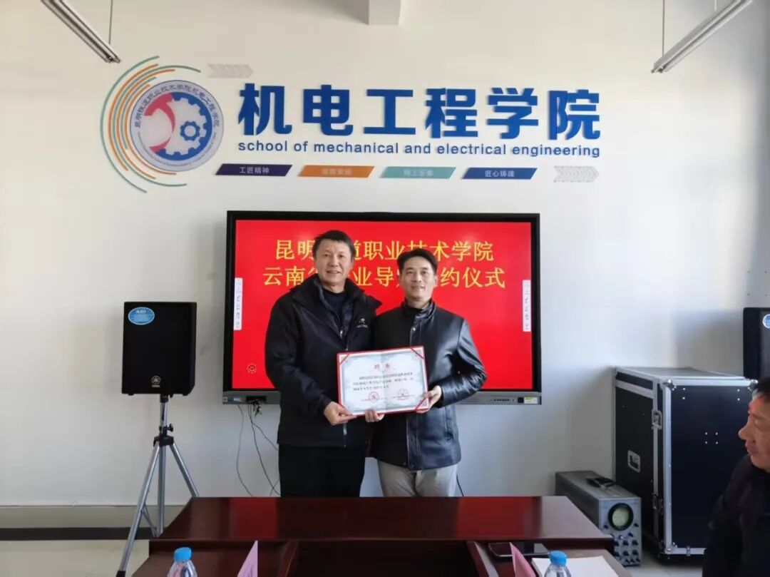 学院副院长田效军代表学院与昆明兆驰科技有限公司董事长侯红林及总经理阙正湘签署三方协议,并向阙正湘颁发产业导师证书。