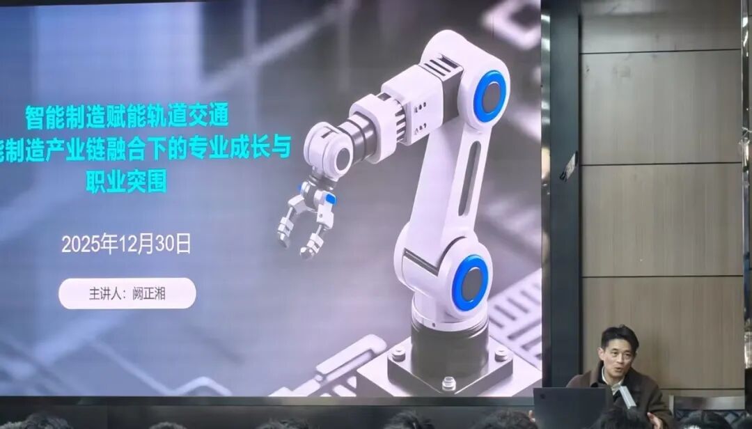 讲座紧扣轨道交通与智能制造融合发展趋势,阙正湘结合昆明兆驰科技有限公司在智能装备研发、工业互联网平台建设等领域经验,解析智能制造技术在轨道交通车辆运维、信号系统升级、智慧车站建设等场景应用现状,对比传统制造与智能生产模式效率差异,展现产业数字化转型核心价值。同时,他围绕智能制造产业链上下游岗位需求,从专业知识、实践技能、职业素养、创业就业四个维度,为学生规划阶梯式成长路径。
