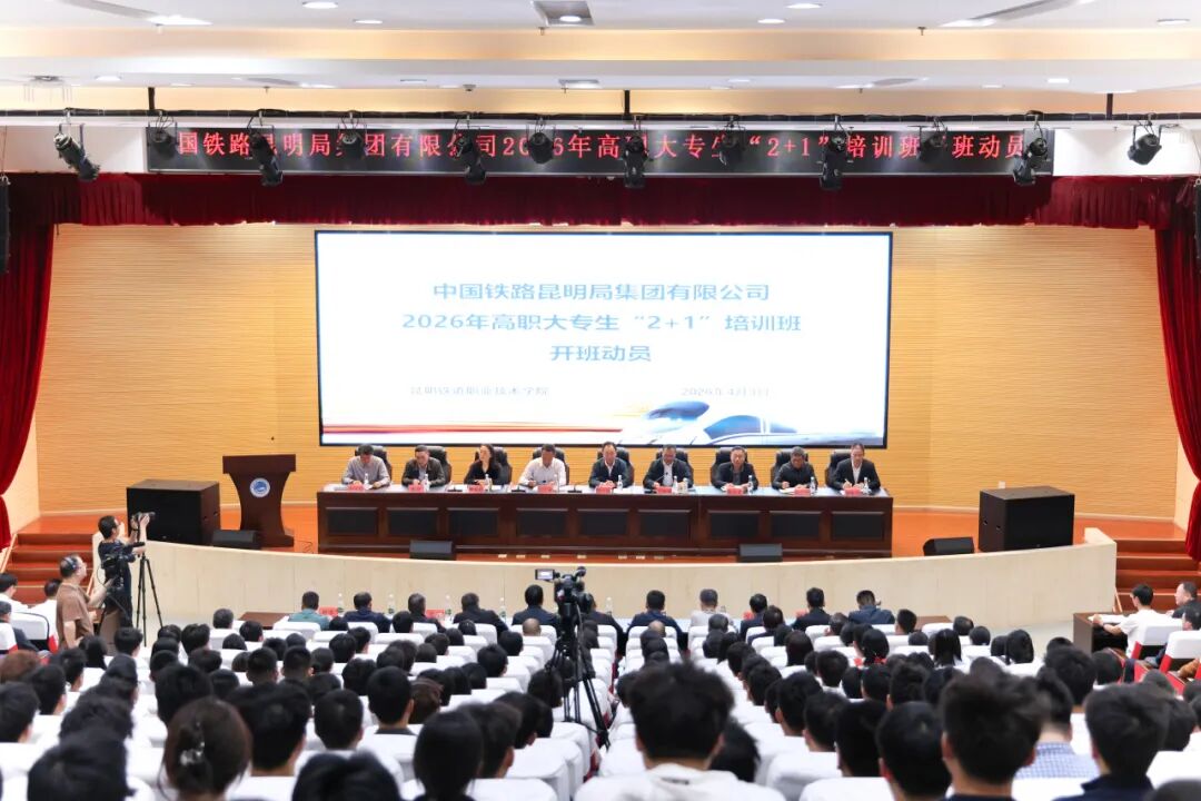 4月3日下午,中国铁路昆明局集团有限公司2026年签约高职大专生“2+1”培训班开班动员会在昆明铁道职业技术学院小石坝校区举行。昆明局集团公司领导,职工培训部、人事部、劳动和卫生部负责人,来自路局各站段相关负责人、校企双方教师代表及926名培训学员参加开班动员会。学院党委书记王树华主持开班动员会。