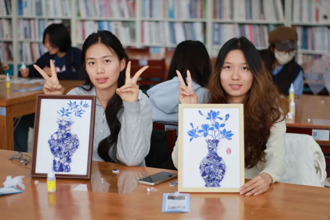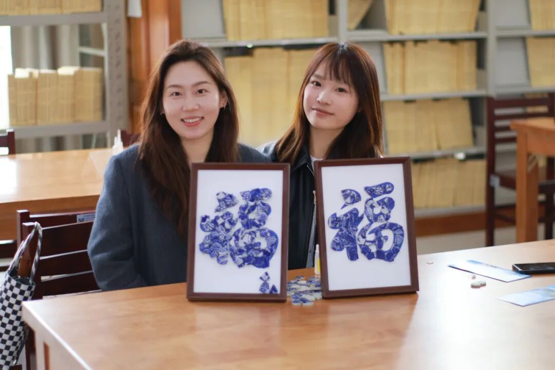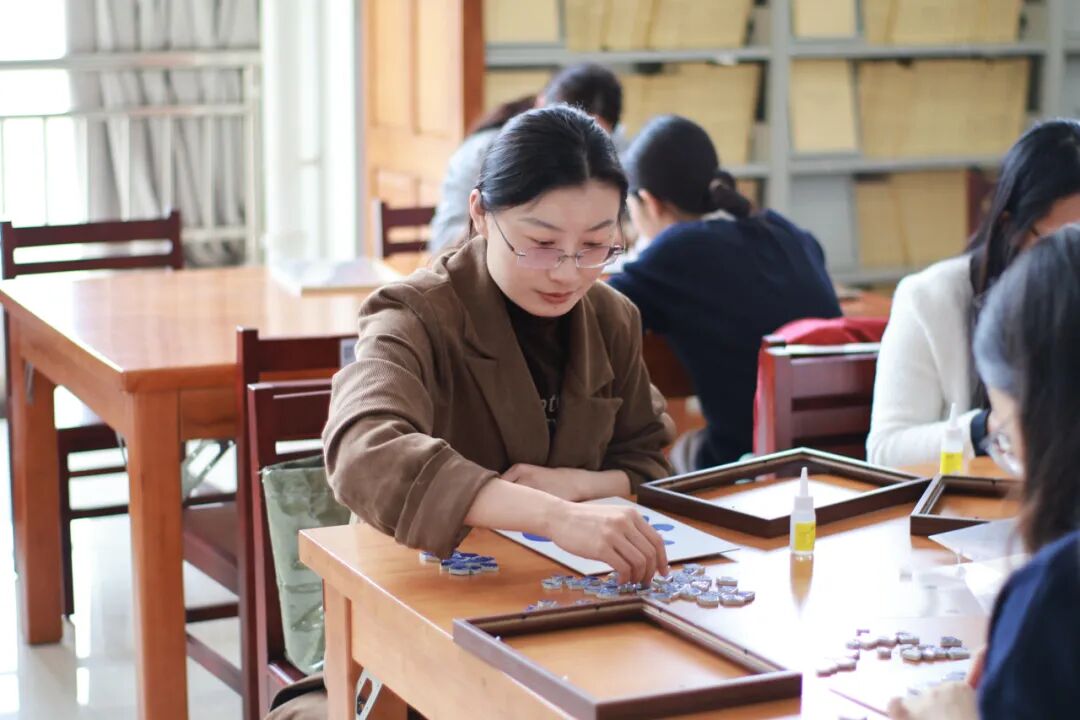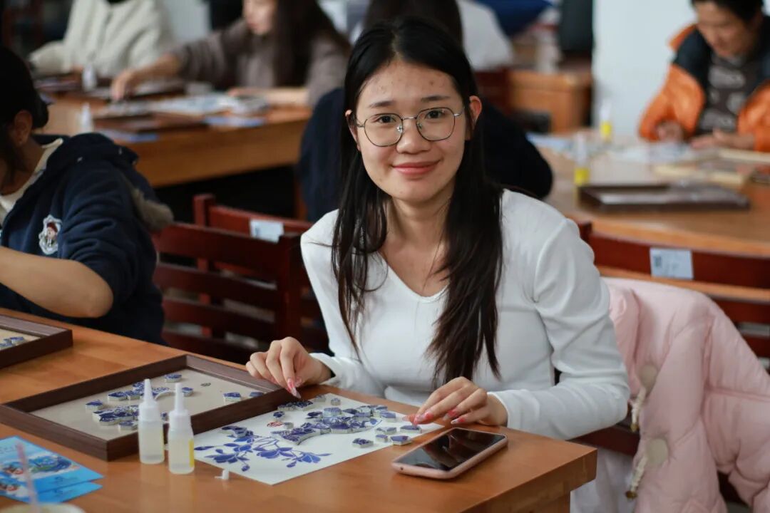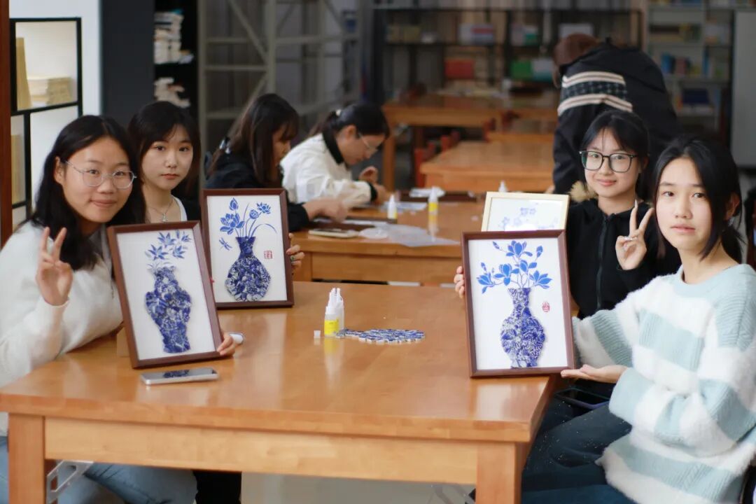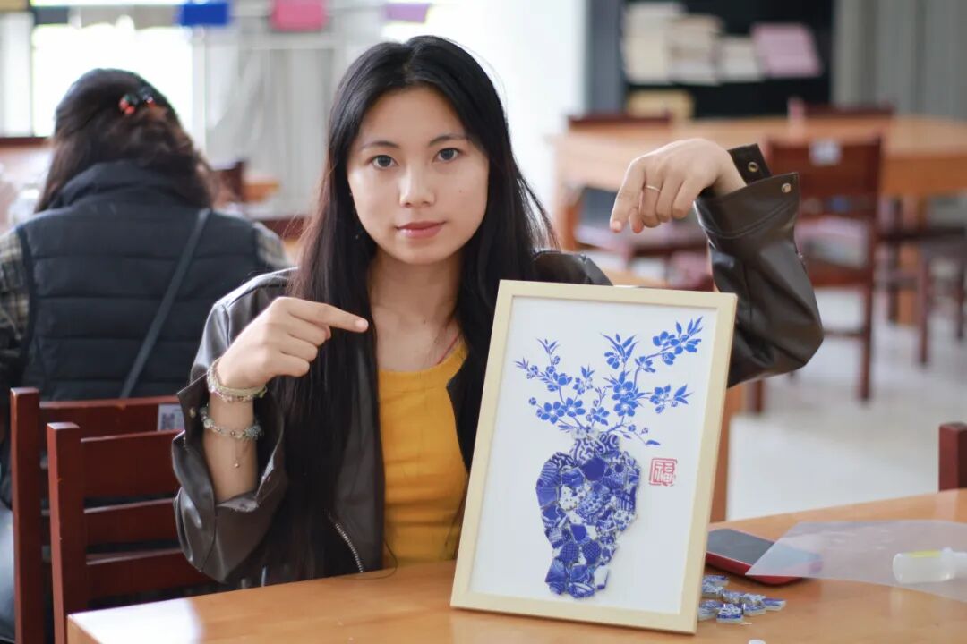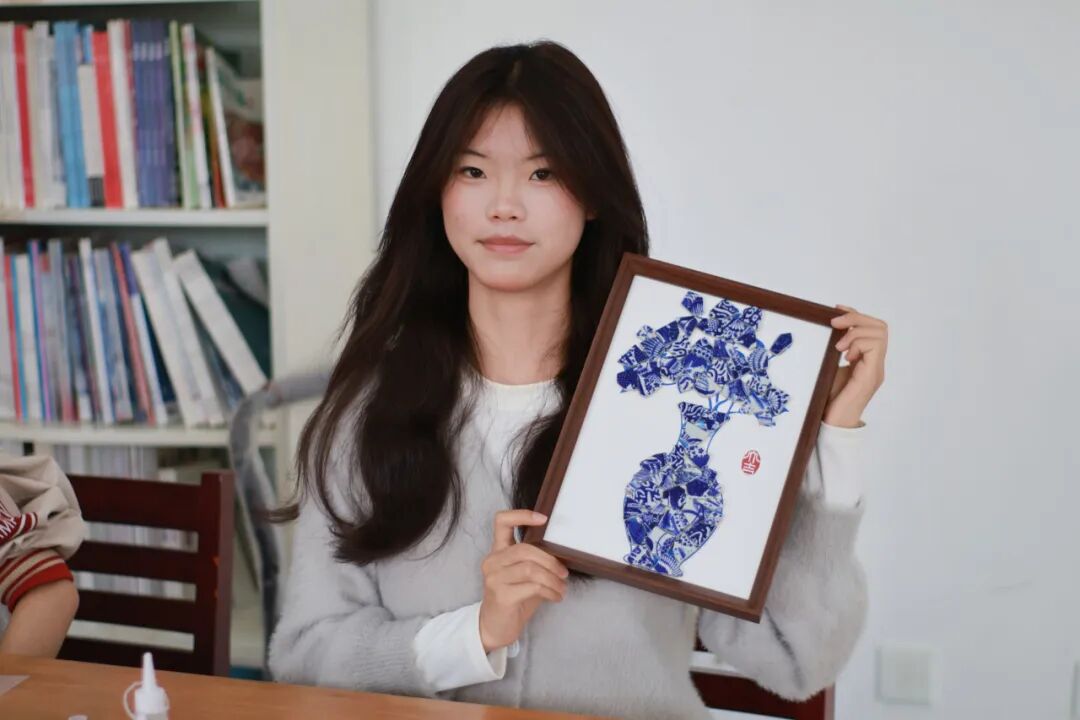 随后,创意手工环节正式展开。老师和同学们纷纷化身“生活艺术家”,面对琳琅满目的青花瓷碎片,她们巧思构图、细心拼贴。经过大家的精心制作,一幅幅独具匠心的青花瓷相框画作品逐一呈现。大家手捧作品合影留念,定格下这美好的瞬间。